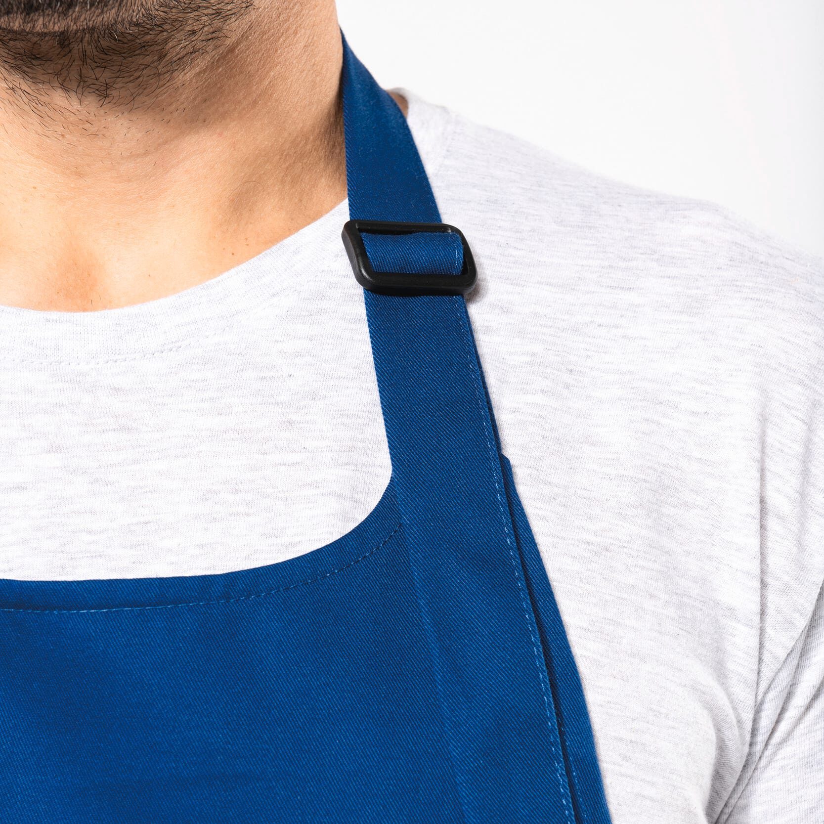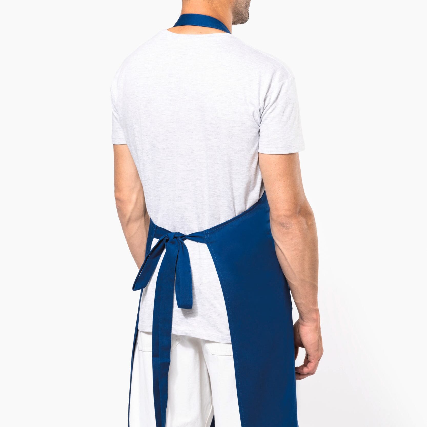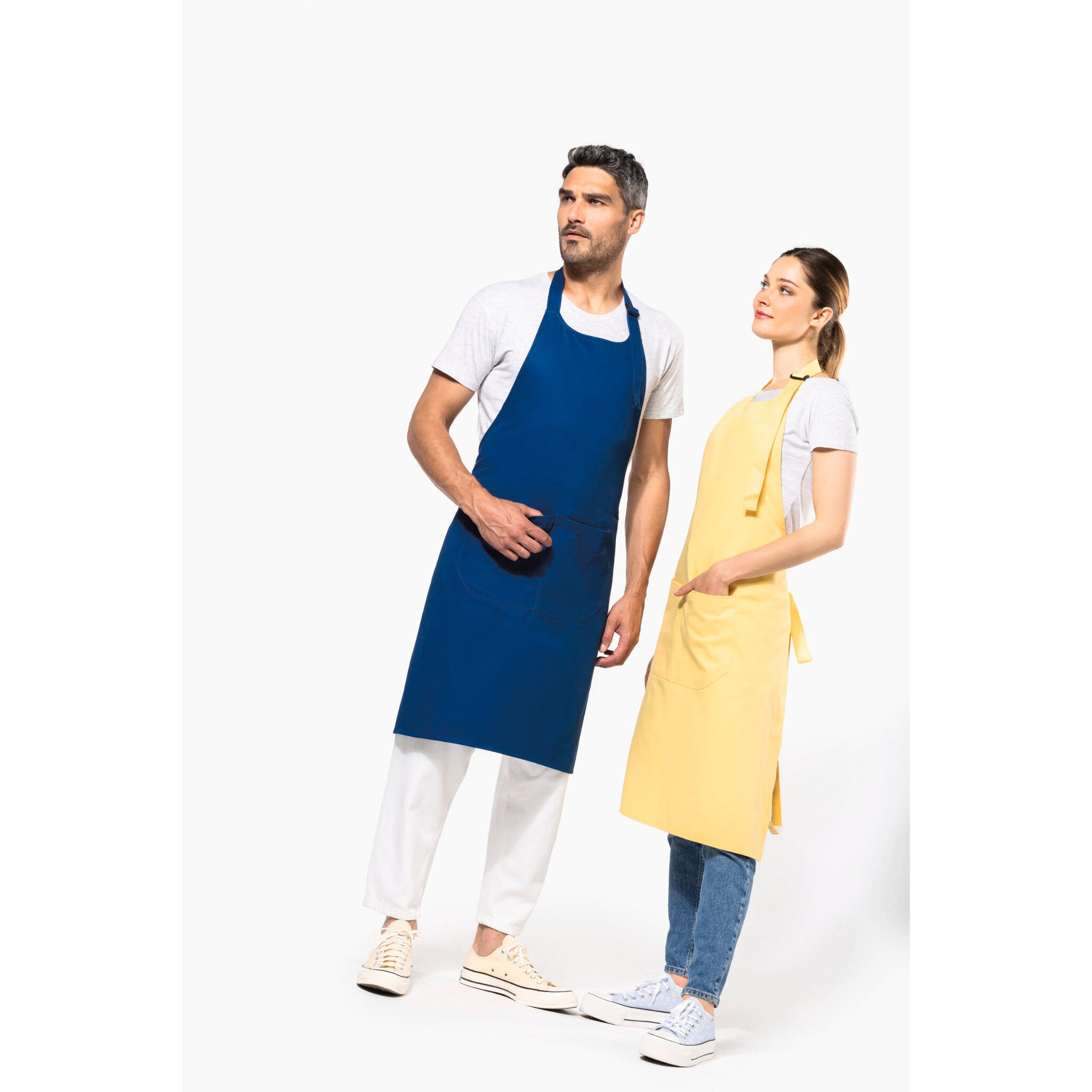 Lavagem doméstica a 60°C. Fivela de regulação em plástico reciclado ao nível do pescoço para ajustar o comprimento do avental. Bolso grande à frente com dois compartimentos. Dimensões: A 90 cm x C 76 cm. Bolso: A 20 cm x C 31,5 cm.