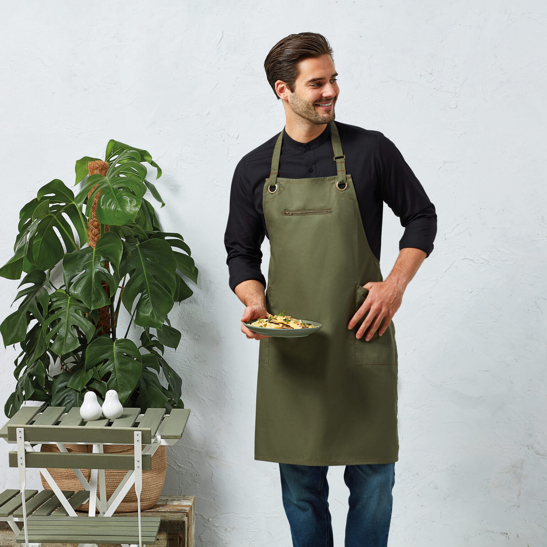 Poliéster reciclado a partir de plástico pós-consumo e algodão proveniente do desenvolvimento sustentável. Ilhós e rebites. Pespontos em contraste. Bolsos laterais e bolso central com fecho. Fivela ajustável em latão envelhecido na alça do pescoço.