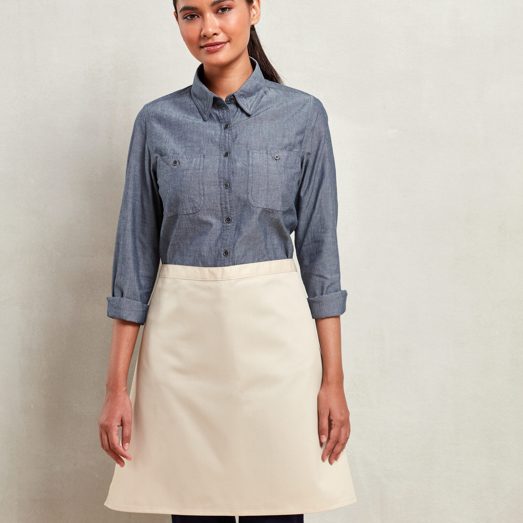 Avental de comprimento médio. Cordões no mesmo tecido. Comprimento: 90 cm. Dimensões: Altura- 50 cm x Largura- 70 cm. Lavagem doméstica a 60 °C. Lavagem industrial a 85 °C.