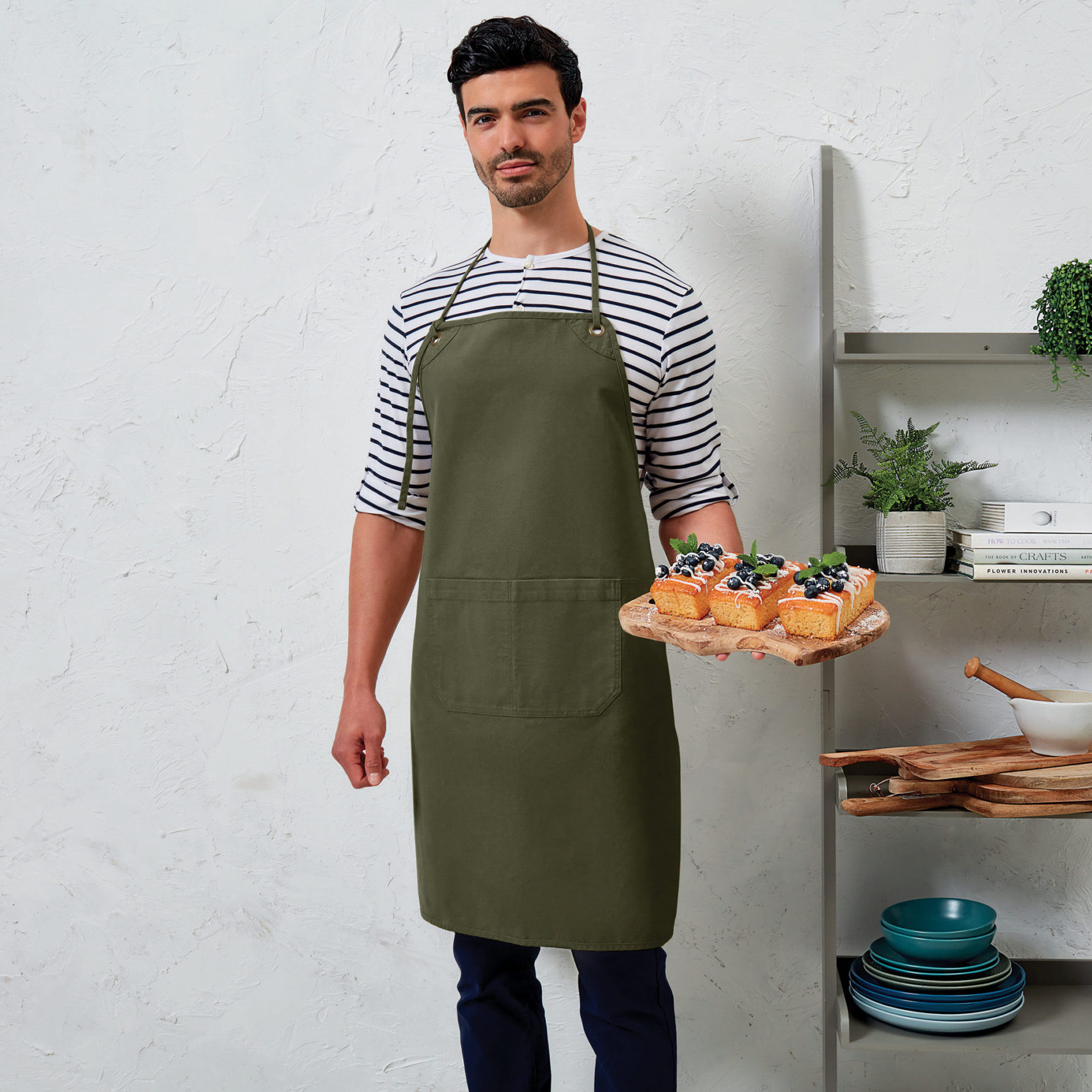 Avental em tela espessa com cantos arredondados. Pode ser usado com peito ou na cintura. Bolso central duplo com 14,5 x 17 cm. Ilhós em latão. Alça no pescoço ajustável com nó.